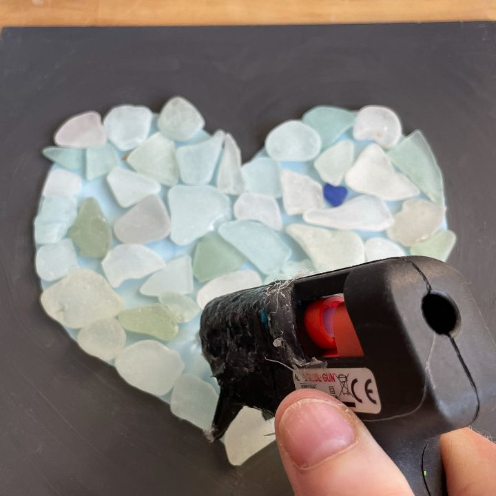 Step 4 – Now for the fun part, arranging the sea glass pieces onto the heart shape on the base. I found it easier to start with pieces along the edge of the heart and then in fill. Arrange all your sea glass before you start to glue down, so you can rearrange if need be.