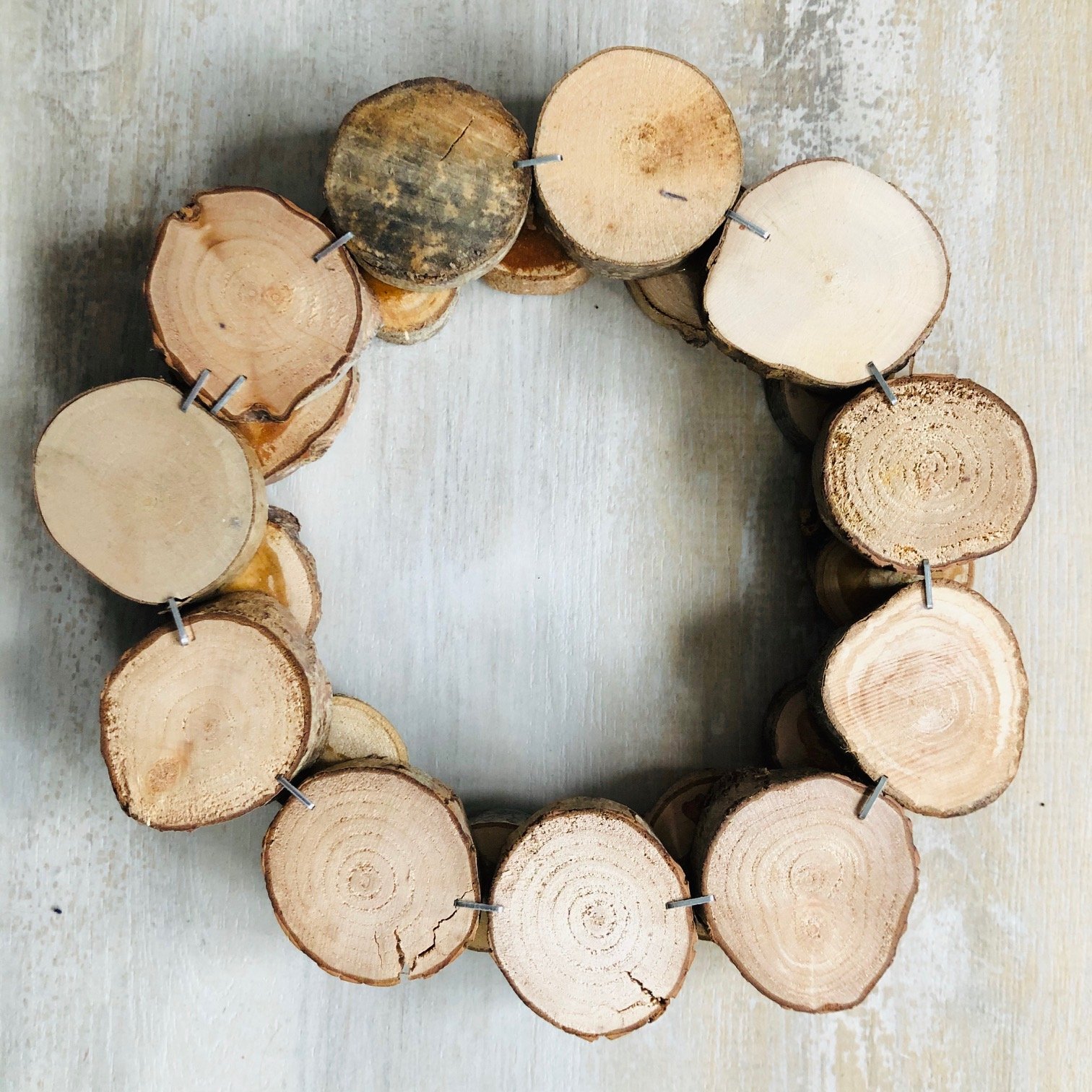 Learn how to make a log slice wreath. Either saw up your old Christmas tree trunk into equal width slices (approx 3/8") and allow the wood to fully dry out. Alternatively, purchase pre-cut wood slices.