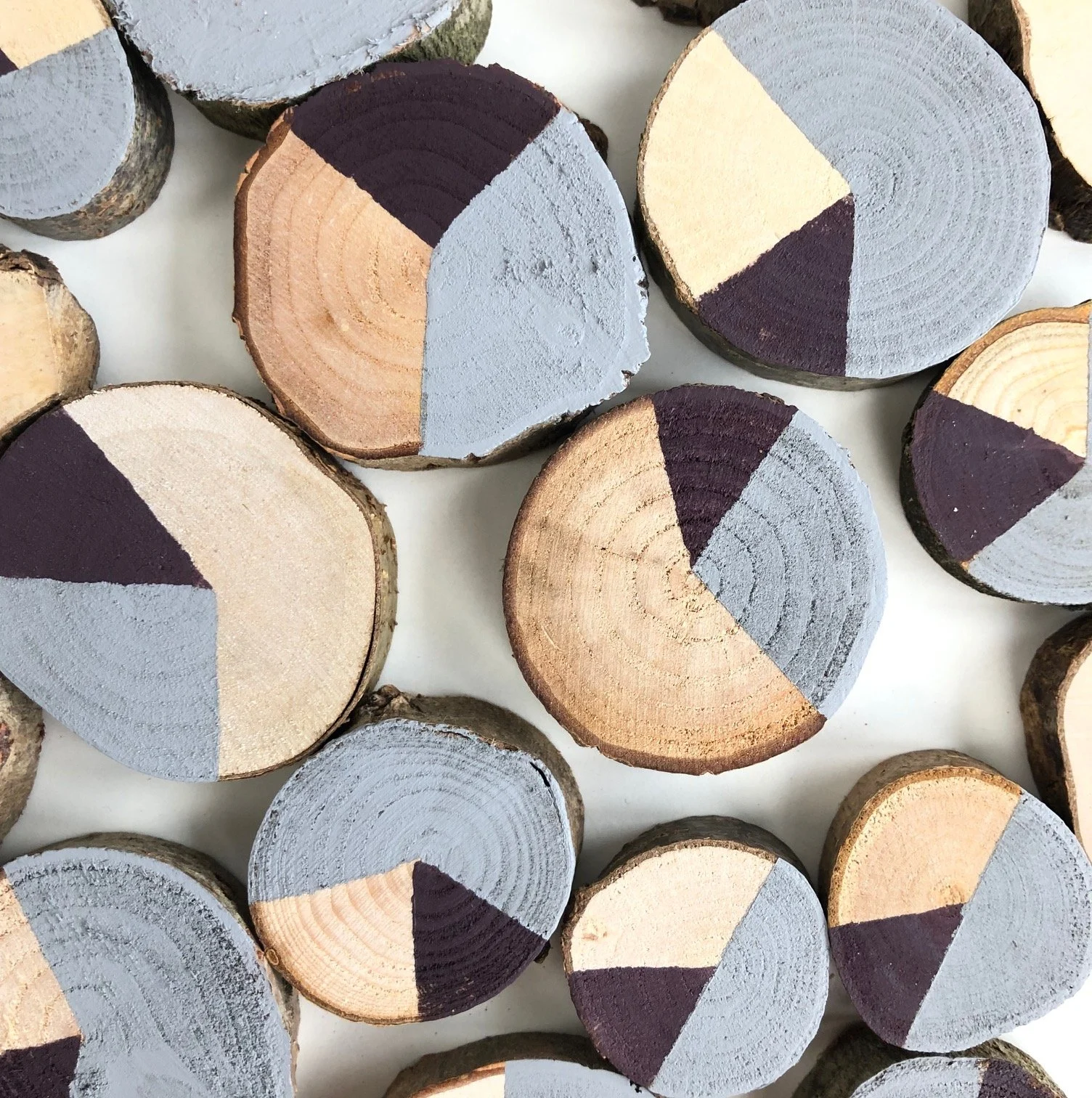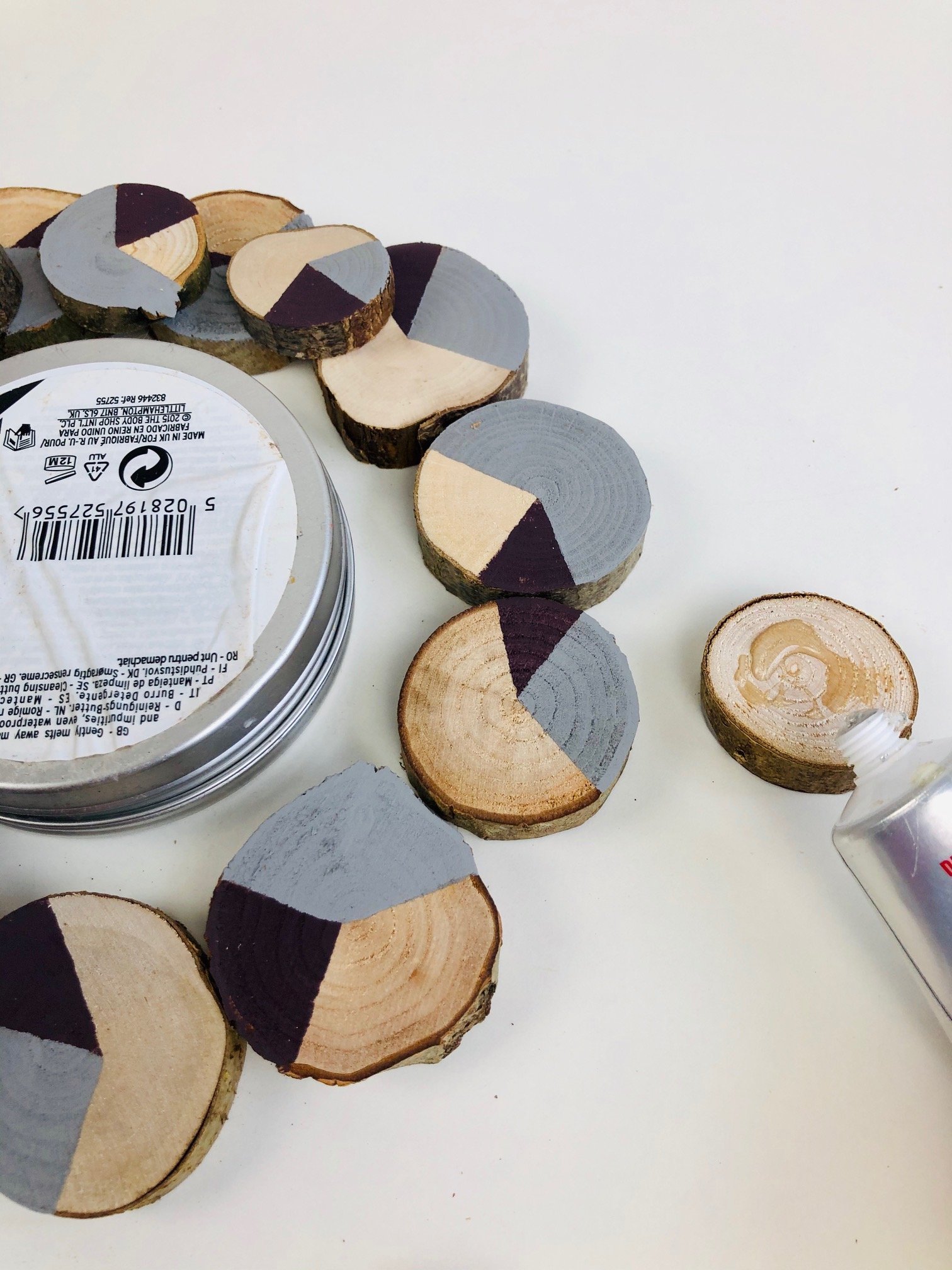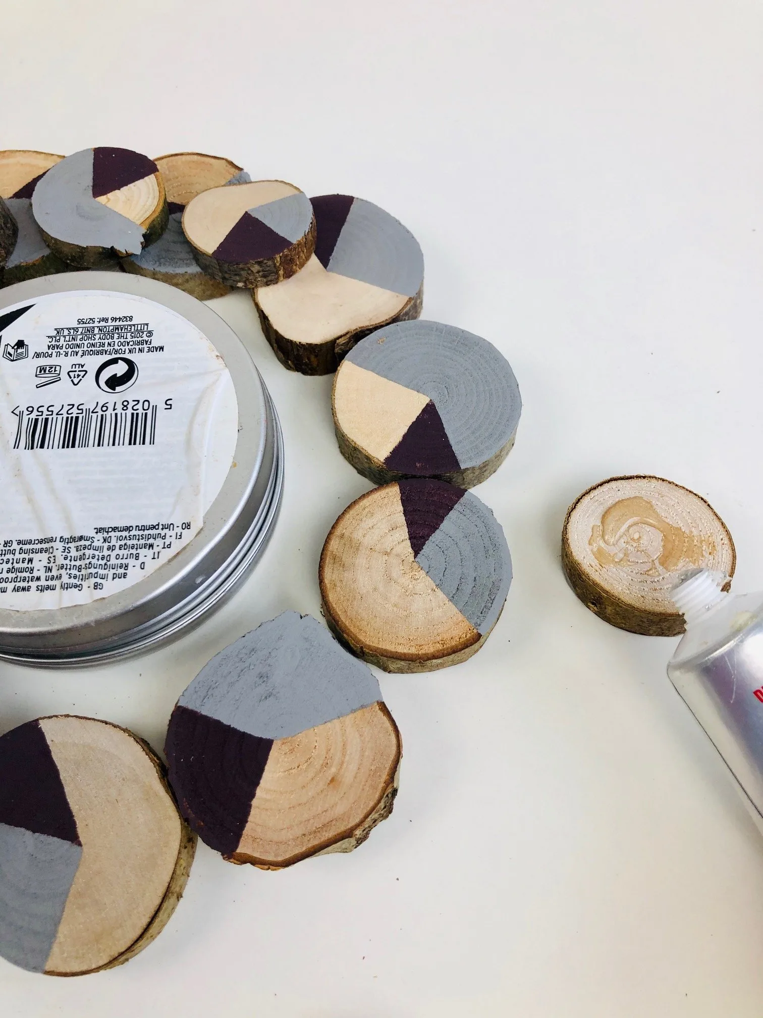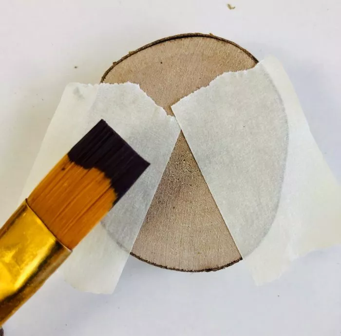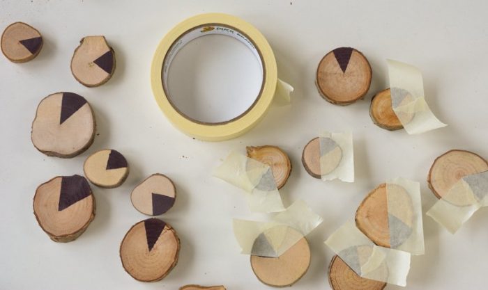 2. Having chosen your wood slices, mark off triangular sections with masking tape for your first layer of paint.